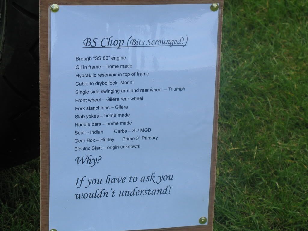 The thing that struck me, is that despite their rarity, their owners are nice people. It's the first show/rally I've been to where the tea and coffee has been 'for a small donation'. I put in £3 for a coffee and 2 Cokes. There were people from Canada, France Ireland and France. I saw a bike being unloaded from a trailer that had come from Holland. There was an ad from 1990 - one was stolen and there was £1000 reward...seems it still hasn't been found. I amazes me how something like that cannot be found.