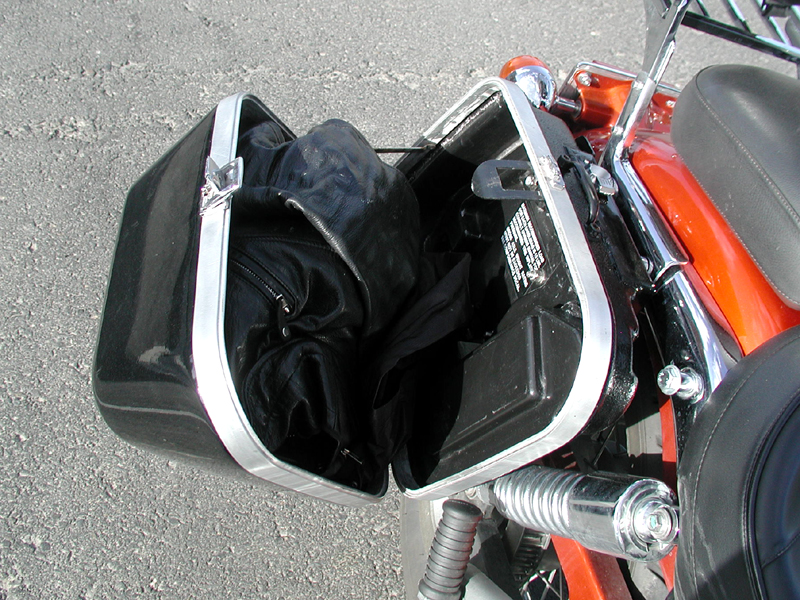 1983 Harley Sport Glide bags. Grafted/extended Easybrackets into the backsides. No idea how many liters, but it's a lot. I have two ballistic nylon attaches that fit in the outer lid completely stuffed, with plenty of room to stuff stuff around them. Here is my old 4XL buffalo leather jacket sitting in one of the lids with plenty of room left for my 5XL buffalo leather chaps.