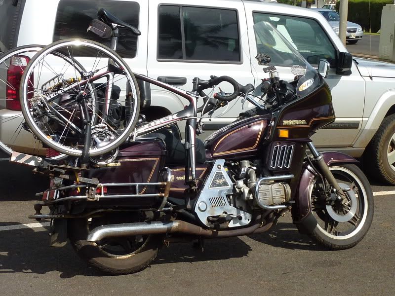 I have a folding bike that I originally got to pedal into town from airports. (most airport food is considered the curse of the private pilot) I found that the front sprocket socketed nicely into the rack I had on my R90/S, so I would haul it to Venus beach and ride the bike road there.