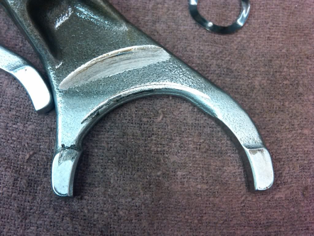 I suspect there's not too many on here who've dug into their gearboxes, but if so does anybody know if the transmissions are interchangeable between 2002-2005? It seems as though 62k miles of torture has taken a toll on my trans, and it's much less expensive to buy used vs. new! i have mine apart and the parts that matter are worn up to or slightly past their service limits. I don't want to do this job again anytime soon. Strangely enough, the main (crankshaft) bearings and journals look almost new! The trained eye will recognize that this fork has been rubbing a gear due to excess wear.(.01mm over spec!) That would explain the jumping in/out/in of 2nd gear under hard acceleration...