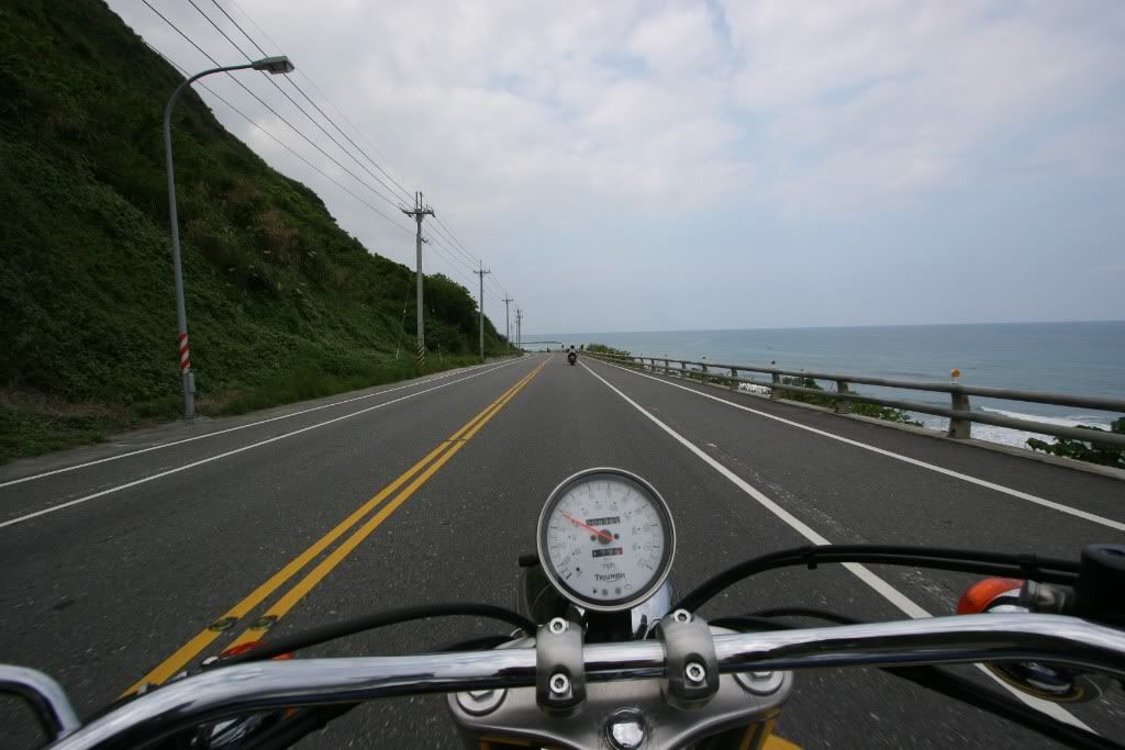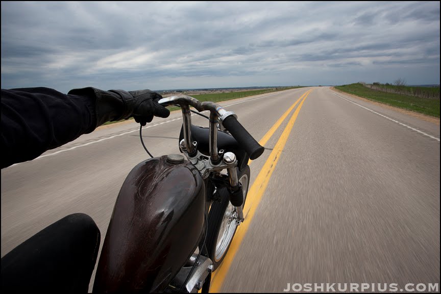 Great shot Tom ! Rule of thirds apply to not only the bike but the destination in the upper right is a shot as well. Two photos in one . Nice color , treeless horizon . Check out how all of the lines converge into one point - the white lines , yellow lines , grey ashalt , the horizon with the green , the left arm , the long axis of the bike .