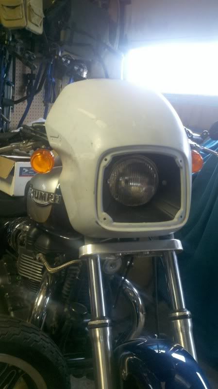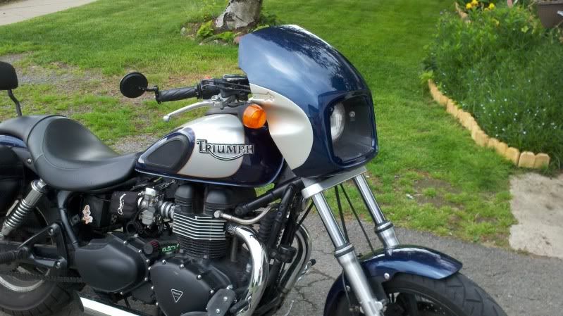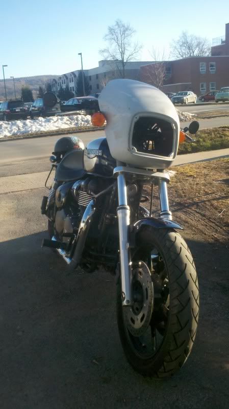 Maybe the Triumph air dam would be a good accent for that look. I remember one post where the poster had relocated his pegs and foot controls back behind the center for more of a cafe' position. But I'm curious to see how she turns out. Good luck with it.