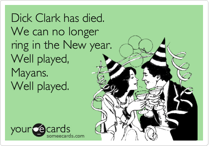 Well I really just HATE to rain on the parade and the wild orgies of unfettered lasciviousness, but it appears that LEAP YEAR was not a Mayan thing and so then every four years that calendar lost one day of accuracy. Over the course of the millinia* it appears that the end has....................already come.  * oh, I misspelted millennia but I edited it here for illustrative purposes but I really think we need to bring the ASTERISK back.
