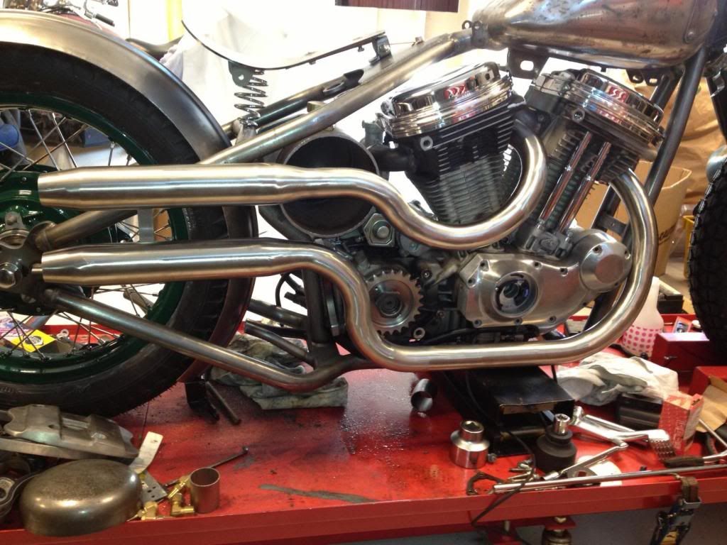 So here is a shot from the right where you can see the raw s/s exhaust that (together w the engine) will be smoothed, polished and then glass blasted for a silky appearance. Pretty cool in my book!