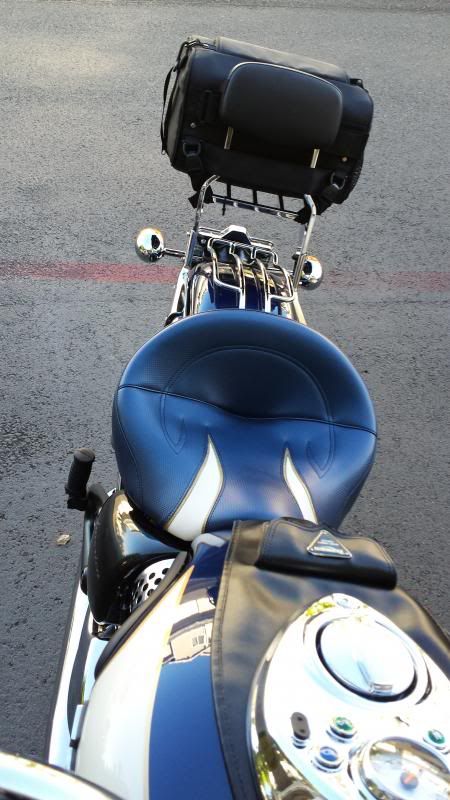It took a wee bit longer than usual to get the new fender rack from Eddy, but it did arrive yesterday. Looks pretty good with the "new" seat I got from a fellow rider (amglo). I think the seat is more comfortable than the stock seat. LOL, I love the reflection from the wax job.
