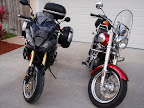 A 2001 Bonnie sits next to my America, both getting tired of waiting for me to come home off the road...